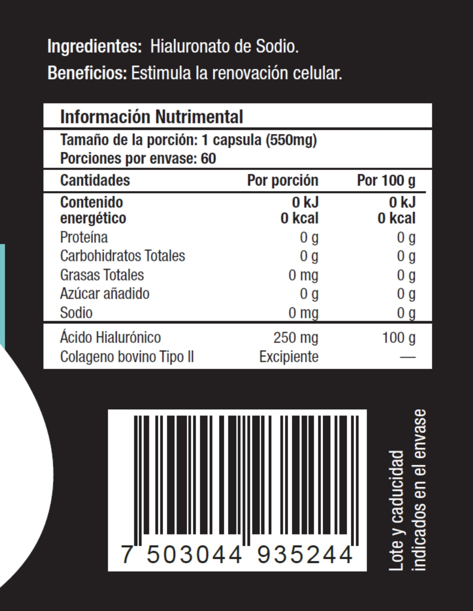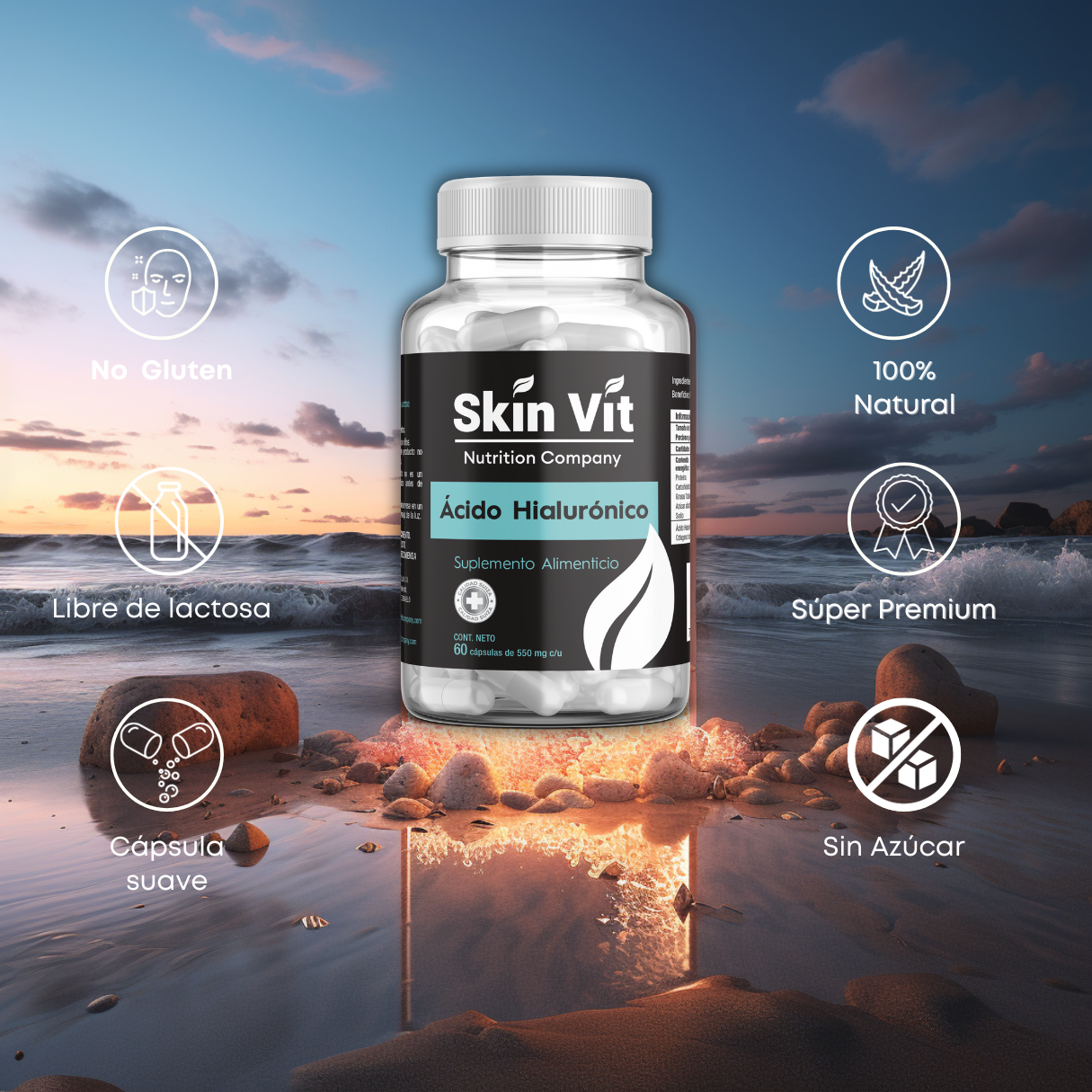 Skin Vit Nutrition Company - Super Premium Health presenta el Ácido Hialurónico en un formato de 60 Cápsulas.
