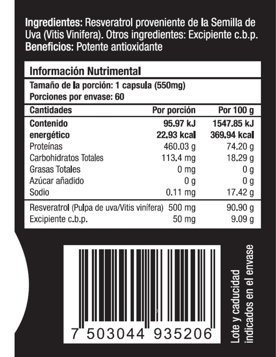 Skin Vit Nutrition Company - Super Premium Health presenta el Resveratrol en un formato de 60 Cápsulas.