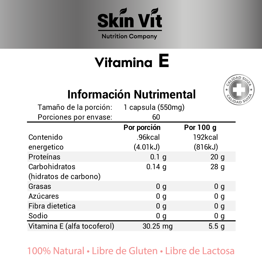 Salud de la piel: La vitamina E puede tener efectos beneficiosos en la salud de la piel. Se ha utilizado en productos para el cuidado de la piel debido a su capacidad para hidratar y reducir la sequedad cutánea. Además, se cree que puede ayudar a reducir los daños causados por la exposición al sol.